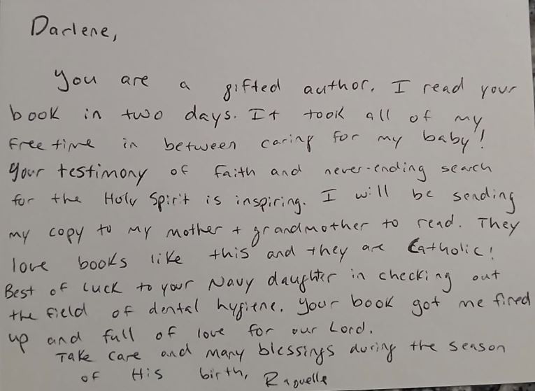 Darlene I read your book in 2 days. I could not put it down. Your BLESSED and in Jesus favor.